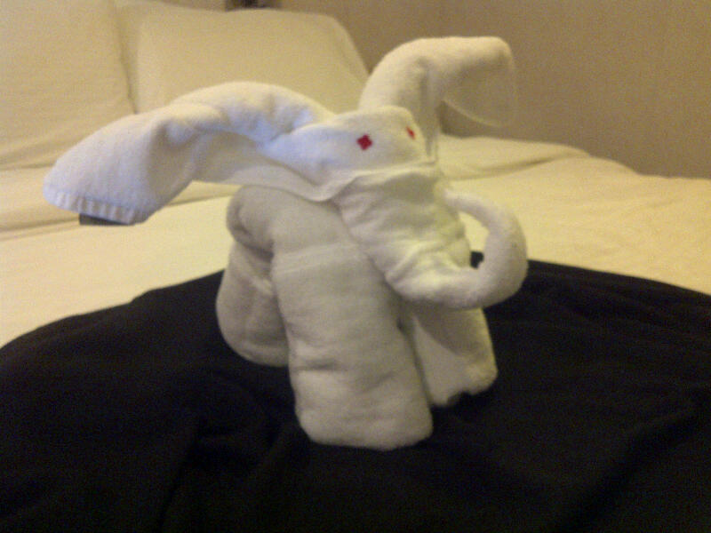 This odd-looking creation, made of towels, is one of many that turned up in our cabin every time the maids made up the bed: